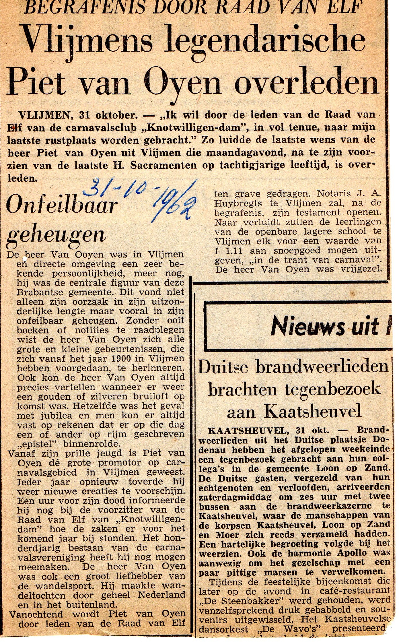 Toen Piet van Oijen zijn dood voelde naderen, had hij reeds de wens te kennen gegeven dat hij met carnavalseer begraven wilde worden, waarbij de Raad van Elf in vol ornaat als slippendragers zouden fungeren. Tegen de pastoor had hij gezegd: “begraaf me maar achteraan op het kerkhof, dat is het goedkoopst en dan luiden de kerkklokken het langst”. Het is allemaal volgens zijn wensen geschied. Prins Carnaval Huipino d’n Ellufde, in vol ornaat, bracht tijdens een kranslegging op het kerkhof nog een laatste saluut op zijn graf. De notaris wreef zich de ogen uit bij het openbaar maken van zijn testament waarin onder andere was bepaald: "op mijn sterfdag zullen gedurende 25 jaar de slippendragers 5 sigaren ontvangen en de helpsters bij mijn laatste koffietafel 2 borrels of 3 glazen bier. De kinderen van het Lompènd en van de Openbare school krijgen voor 111 centen snoepgoed aangeboden. "